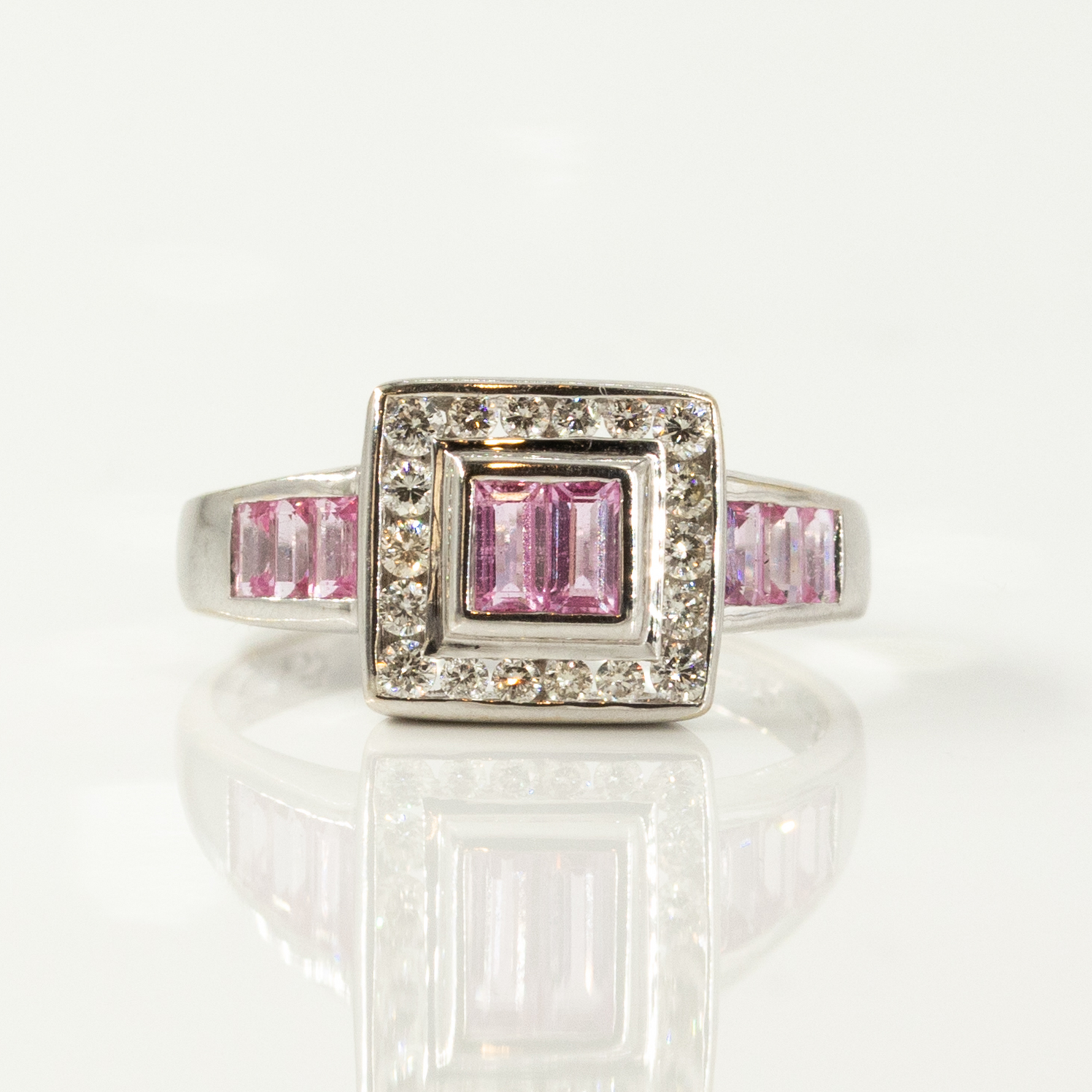 This vintage pink sapphire and natural diamond ring is a striking fusion of elegance and geometric design. At its centre, two baguette-cut pink sapphires (0.40CT) are set side by side, their delicate yet vibrant hue accentuated by a sparkling halo of natural diamonds (0.36CT) in a square-shaped setting. Crafted in 18CT white gold, the setting enhances the brilliance of the diamonds while complementing the rich pink tones of the sapphires.
