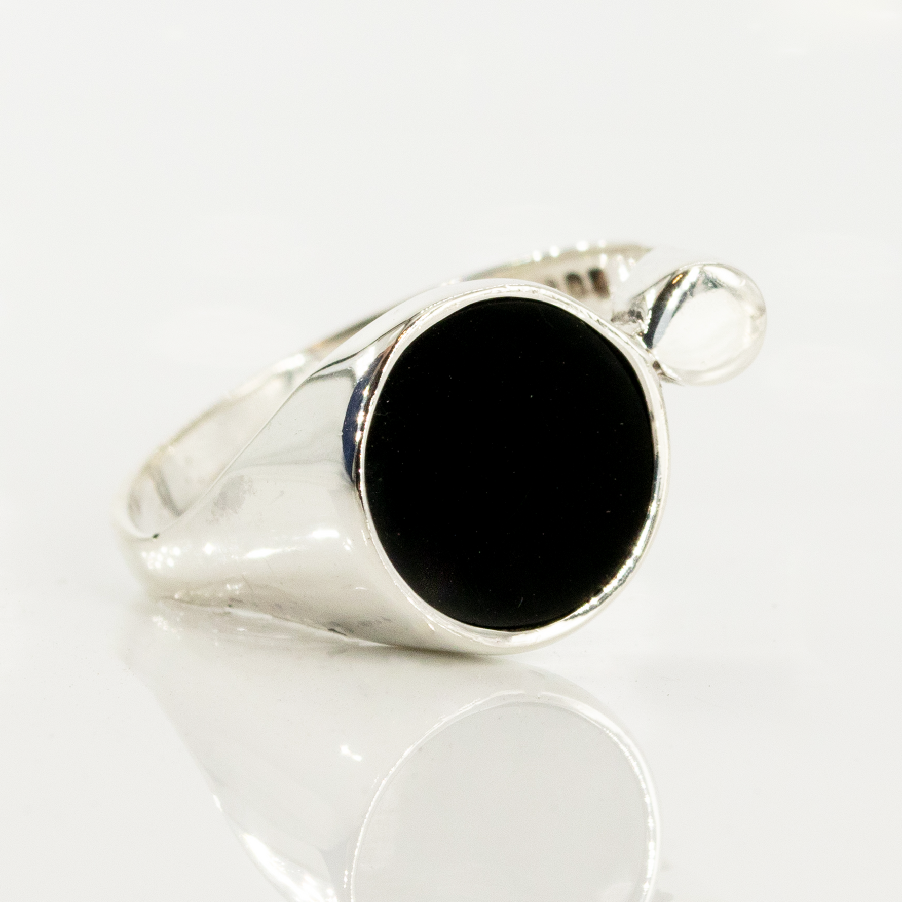 This vintage black onyx signet ring in silver features a sleek and refined design. A beautiful sliver of black onyx is set seamlessly within an oval silver frame, creating a bold yet understated look. The band connects to a smaller silver oval, adding a subtle yet distinctive detail to the overall design. The smooth, polished finish enhances the vintage character of this piece, making it a sophisticated accessory with a unique structural element.